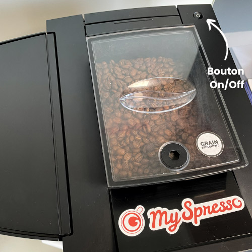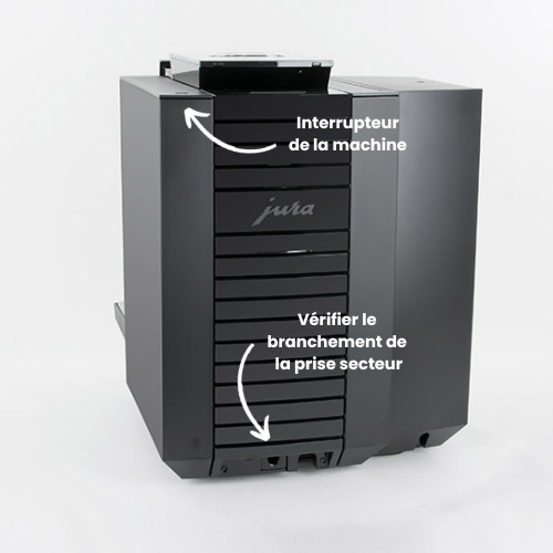Si votre machine à café Jura X6 est éteinte, il suffit de la brancher à la prise secteur et d’appuyer sur la touche On/Off située au dessus dans le coin à droite de la machine.