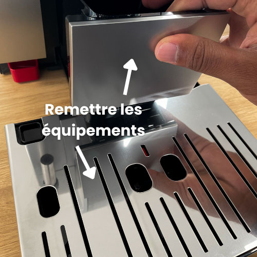 Remettez ensuite le couvercle du bac d’égouttage et le bac à marc dans son emplacement dédié.