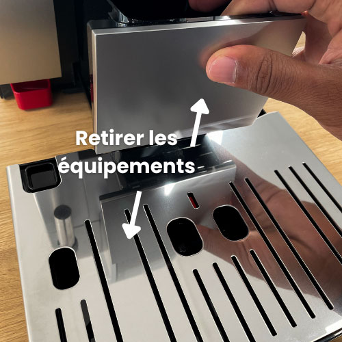 Posez le bac à égouttage, puis prenez le bac à marc de café qui est amovible et posez-le. Retirez ensuite le couvercle du bac d’égouttage.