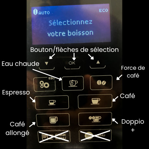 Sélectionnez votre café souhaité en cliquant sur le bouton correspondant. Il faut changer le niveau de force de café grâce au bouton dédié avant de lancer la préparation.