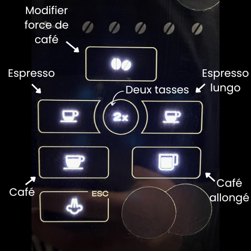 Enfin, vous avez la possibilité de changer la force de votre café en appuyant sur le bouton correspondant (voir ci-dessous). Plus le niveau indiqué sera haut, plus votre café sera fort.