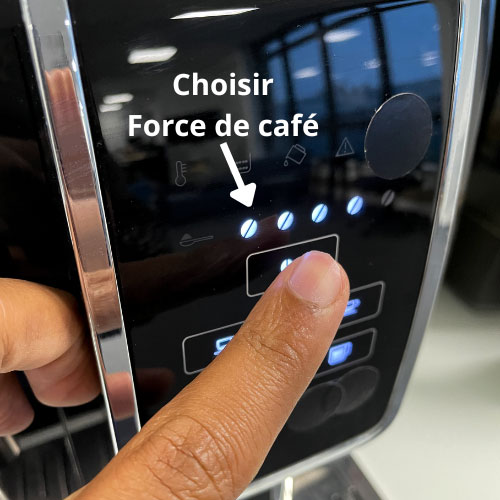 DINAMICA Mon café n’est pas assez fort Étape 1 Pour augmenter la force du café, il suffit de cliquer sur le bouton indiqué sur l’image, jusqu’au degré de force de café souhaité. retour